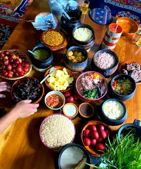 Bhutanese cuisine is renowned for its bold, spicy flavors and the use of locally sourced ingredients like rice, chilies, cheese, and yak meat. The national dish, ema datshi, features chili peppers cooked in a rich cheese sauce. Other well-loved dishes include momos (dumplings), phaksha paa (pork cooked with red chilies), and jasha maru (a spicy chicken stew).