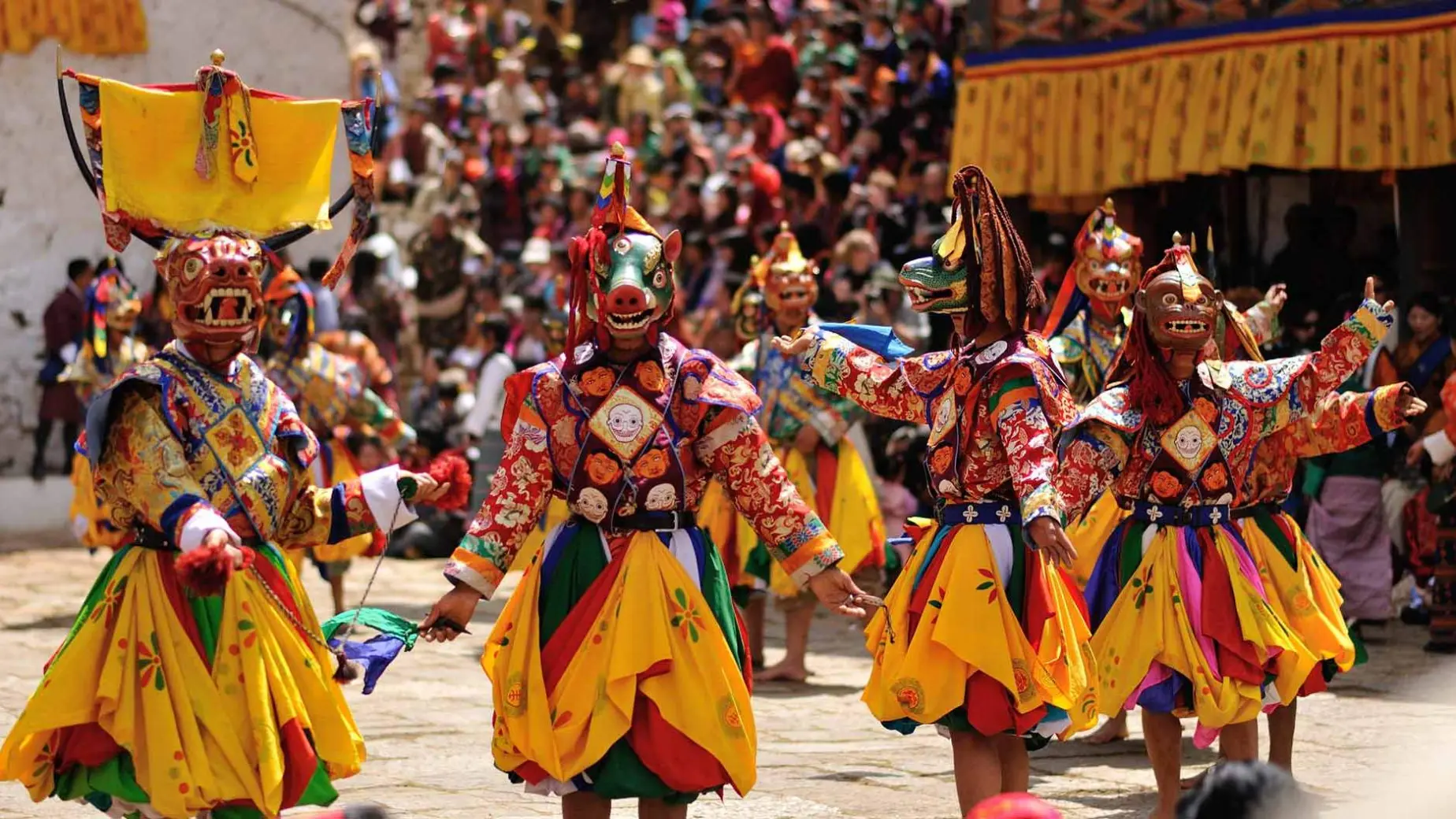 Paro Tshechu is one of Bhutan's most celebrated festivals, showcasing vibrant dances performed by trained monks and laypeople in elaborate masks and costumes. Tshechus are deeply rooted in Bhutan's culture, honoring Guru Rinpoche, the saint who introduced Buddhism to the country. A major highlight of the Paro Tshechu is the unveiling of the immense silk Thangka, or ‘thongdroel,’ which is so large it covers the face of an entire building. Considered one of the most sacred blessings in Bhutan, the Thangka is displayed for only a few hours at dawn on the festival's final day, allowing people to receive its blessing. In Bhutanese, 'thongdroel' means "liberation by the mere sight of it," symbolizing its profound spiritual significance.
