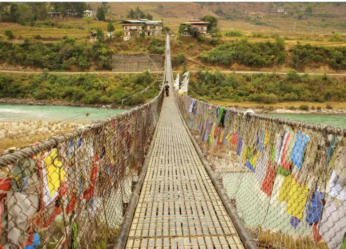 The Punakha Suspension Bridge, Bhutan's second-longest, spans the Mo Chhu and Po Chhu rivers, stretching 160-180 meters. One of the oldest in the world, it was built by Thangtong Gyalpo and has been renovated over the years. Connecting the villages of Samdingkha and Wangkha, it holds historical significance. Adorned with prayer flags, it offers great opportunities for bird watching and photography. While sturdy, it sways in strong winds, adding a thrilling experience.
