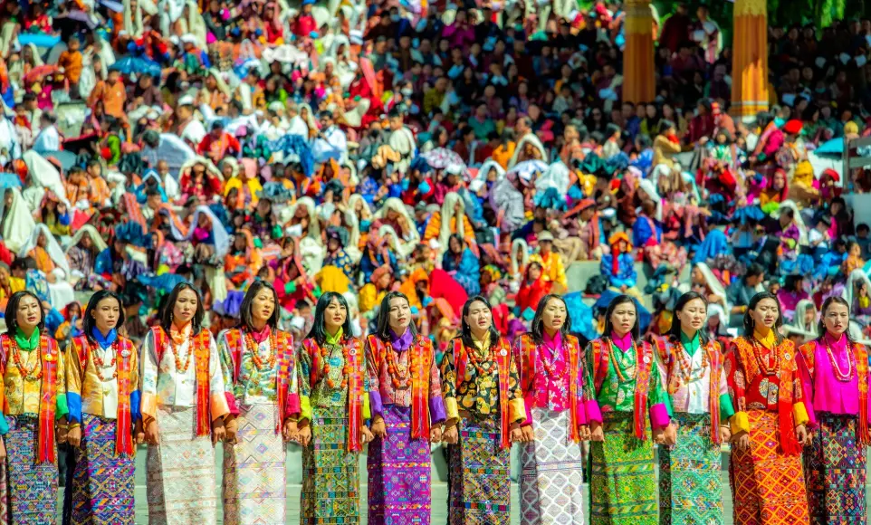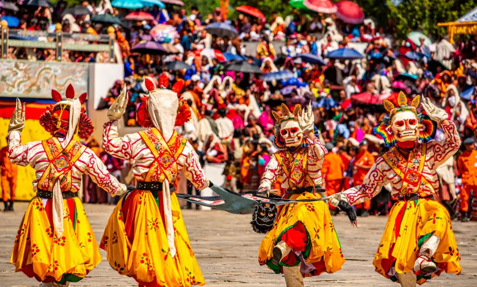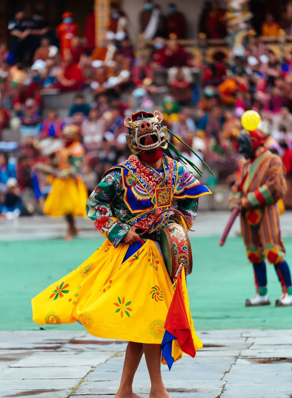 The Jambay Lhakhang Drup, held at one of Bhutan's oldest temples, is an exciting festival featuring the fire offering and the naked dance, both performed on the full moon night. Locals believe that passing through the fire arch removes obstacles, while the naked dance symbolizes primordial wisdom, helping to overcome fear and anxiety. The festival also includes other vibrant dances, such as the Dance of the Four Garudas, the Stick Dance, and the Drum Dance of Dorji Lingpa.