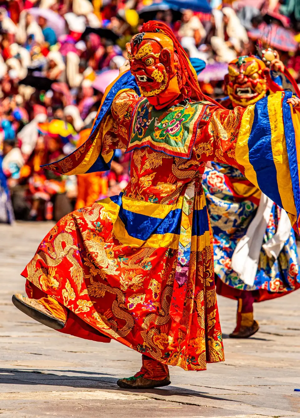 Paro Tshechu is one of Bhutan's most celebrated festivals, showcasing vibrant dances performed by trained monks and laypeople in elaborate masks and costumes. Tshechus are deeply rooted in Bhutan's culture, honoring Guru Rinpoche, the saint who introduced Buddhism to the country. A major highlight of the Paro Tshechu is the unveiling of the immense silk Thangka, or ‘thongdroel,’ which is so large it covers the face of an entire building. Considered one of the most sacred blessings in Bhutan, the Thangka is displayed for only a few hours at dawn on the festival's final day, allowing people to receive its blessing. In Bhutanese, 'thongdroel' means "liberation by the mere sight of it," symbolizing its profound spiritual significance.